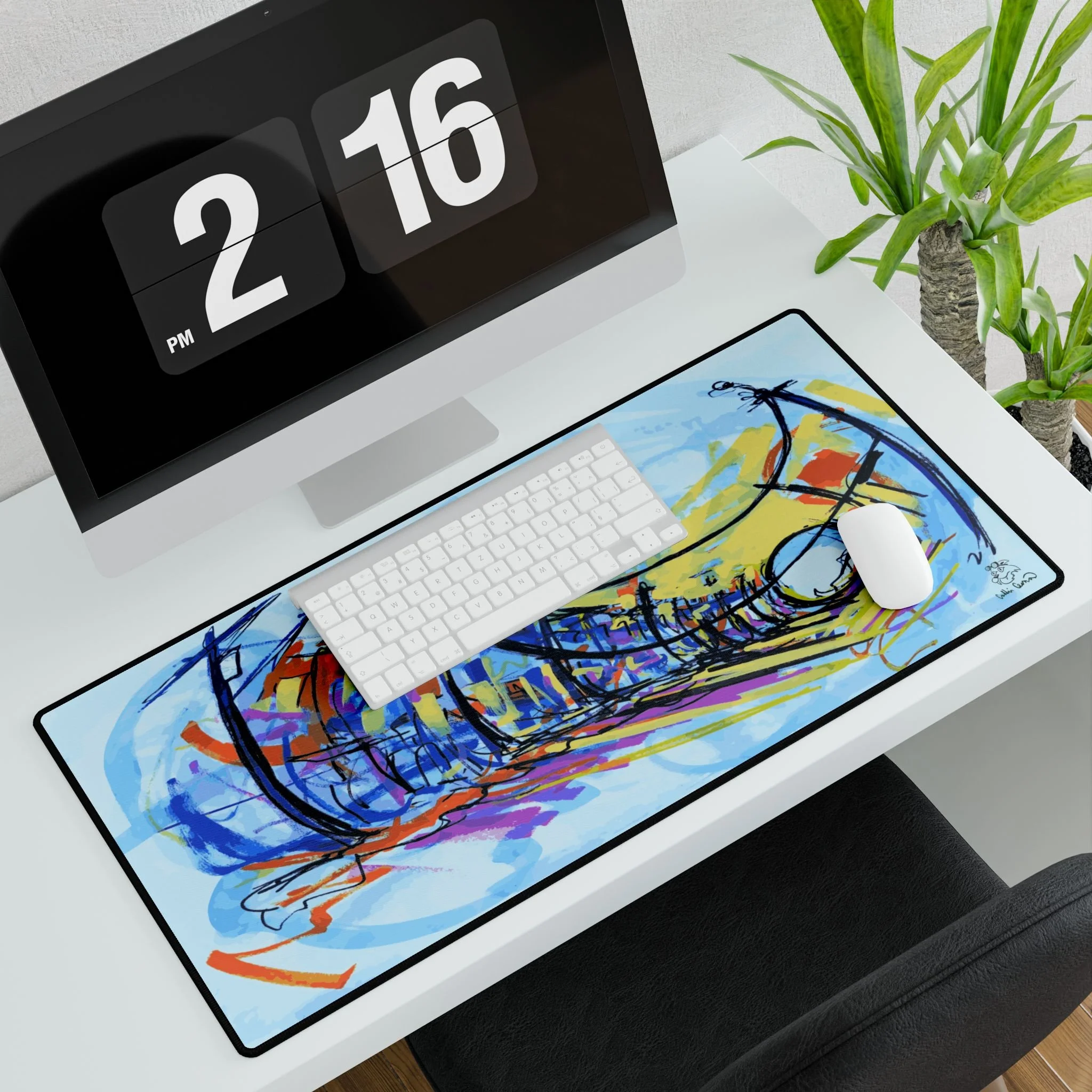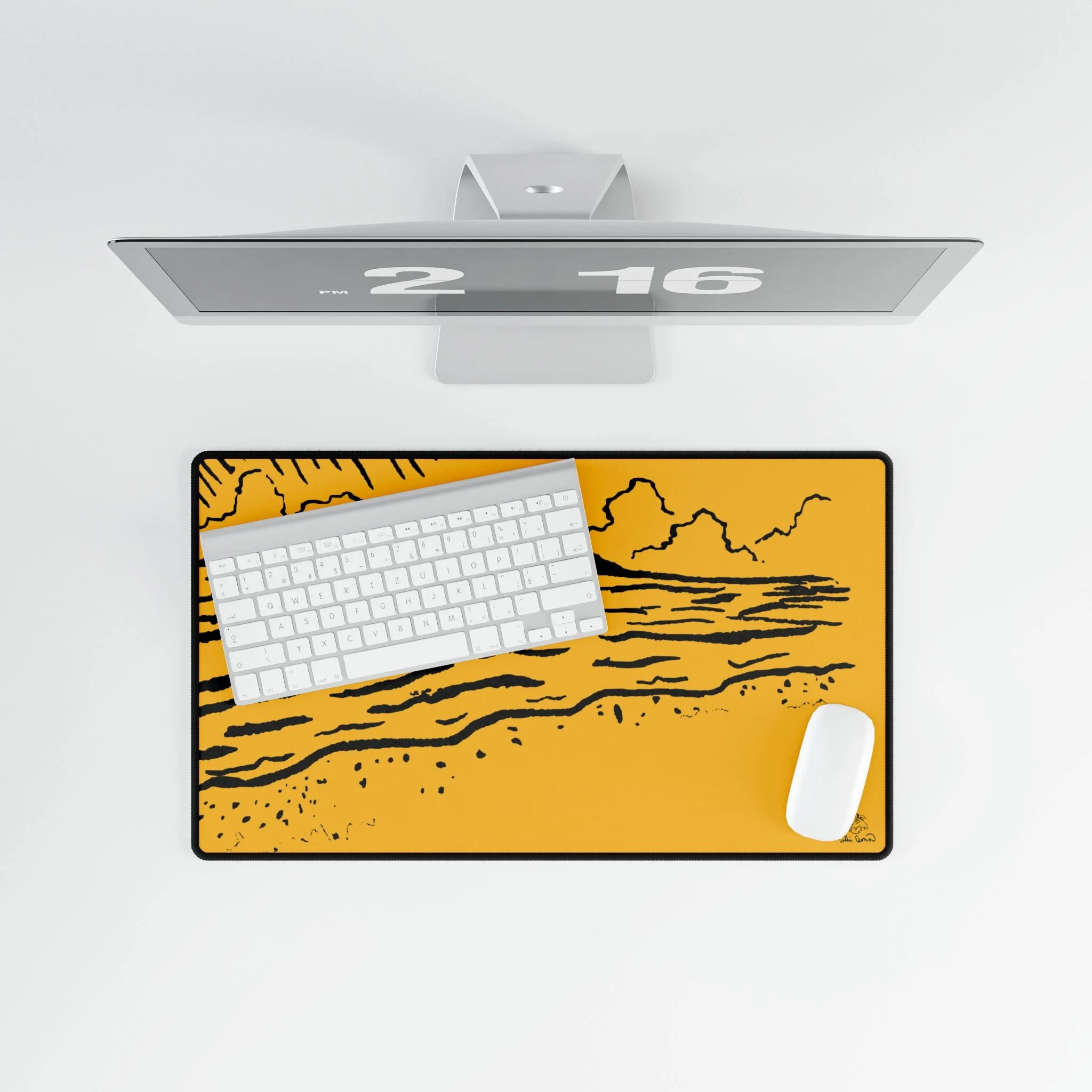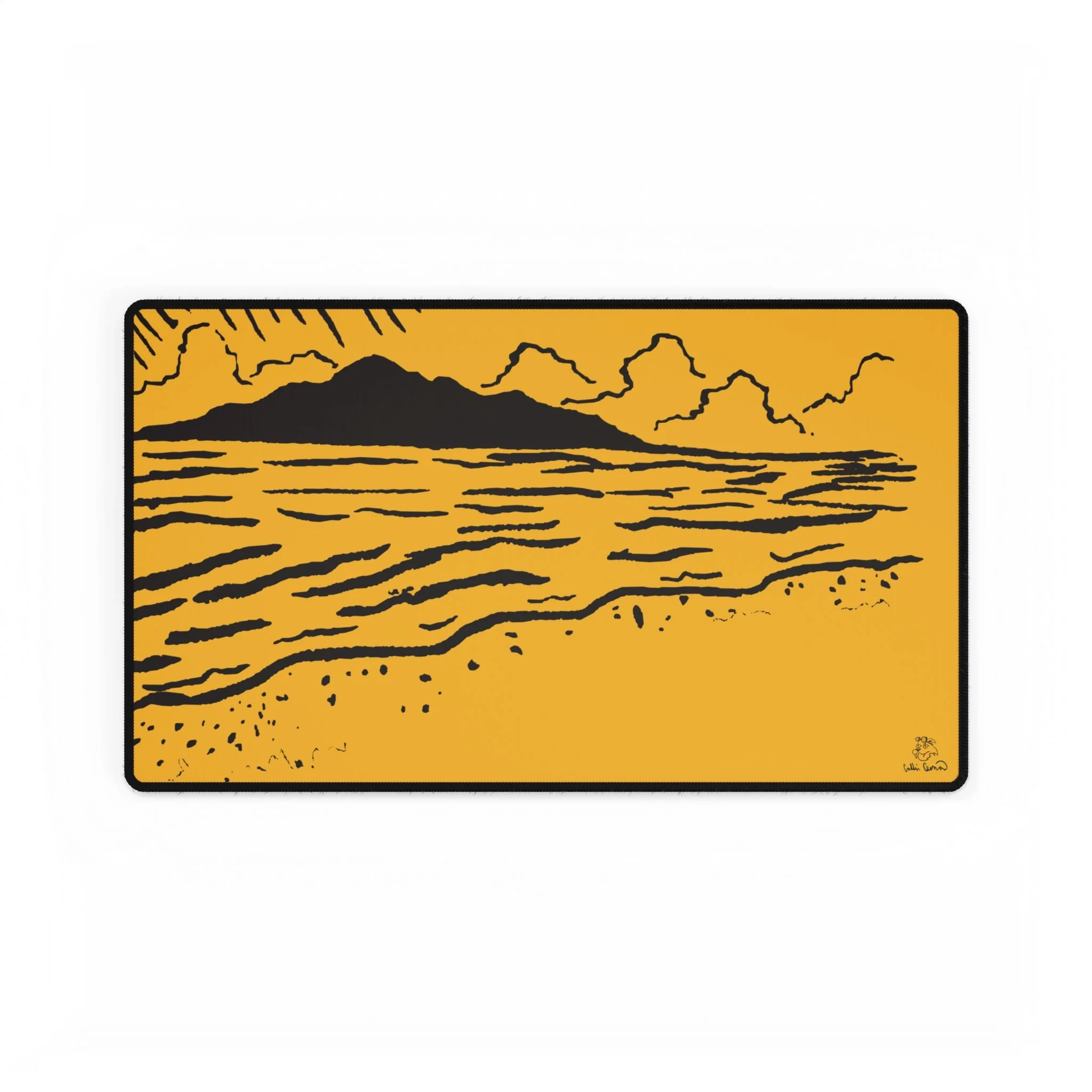 Breathe a little coastline into your workspace. This generously sized desk mat lays down a warm, golden background with a hand-drawn shore and distant islands—simple lines, bold color. It quiets visual clutter and gives your mouse a silky surface to glide across while adding a calm, creative mood to the desk. Slide your keyboard and mouse onto it to anchor your setup; let those ochre tones and minimalist waves remind you of slow mornings, late-afternoon light, and places where time seems softer.