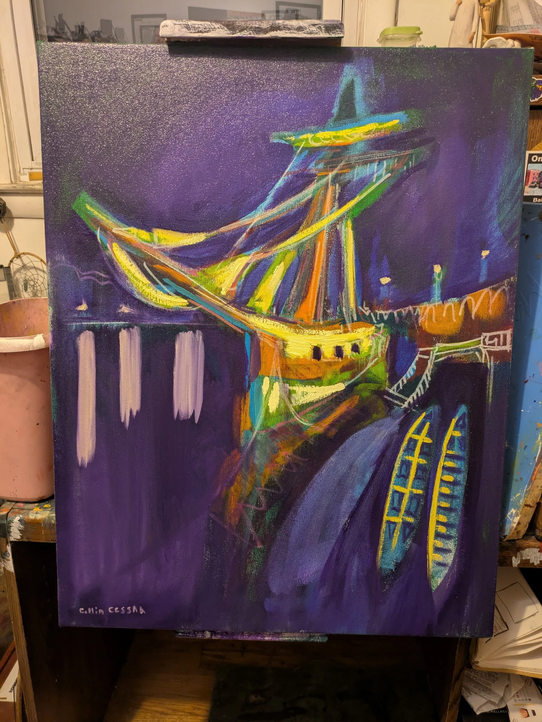 I just completed this painting about an hour ago! I stretched and primed the canvas today. As soon as the gesso was dry, I started painting. This is an oil painting over an acrylic base. I believe this painting is 24” x 30” as soon as it is dry it will be on display at Snakehill grill in Highlandtown.