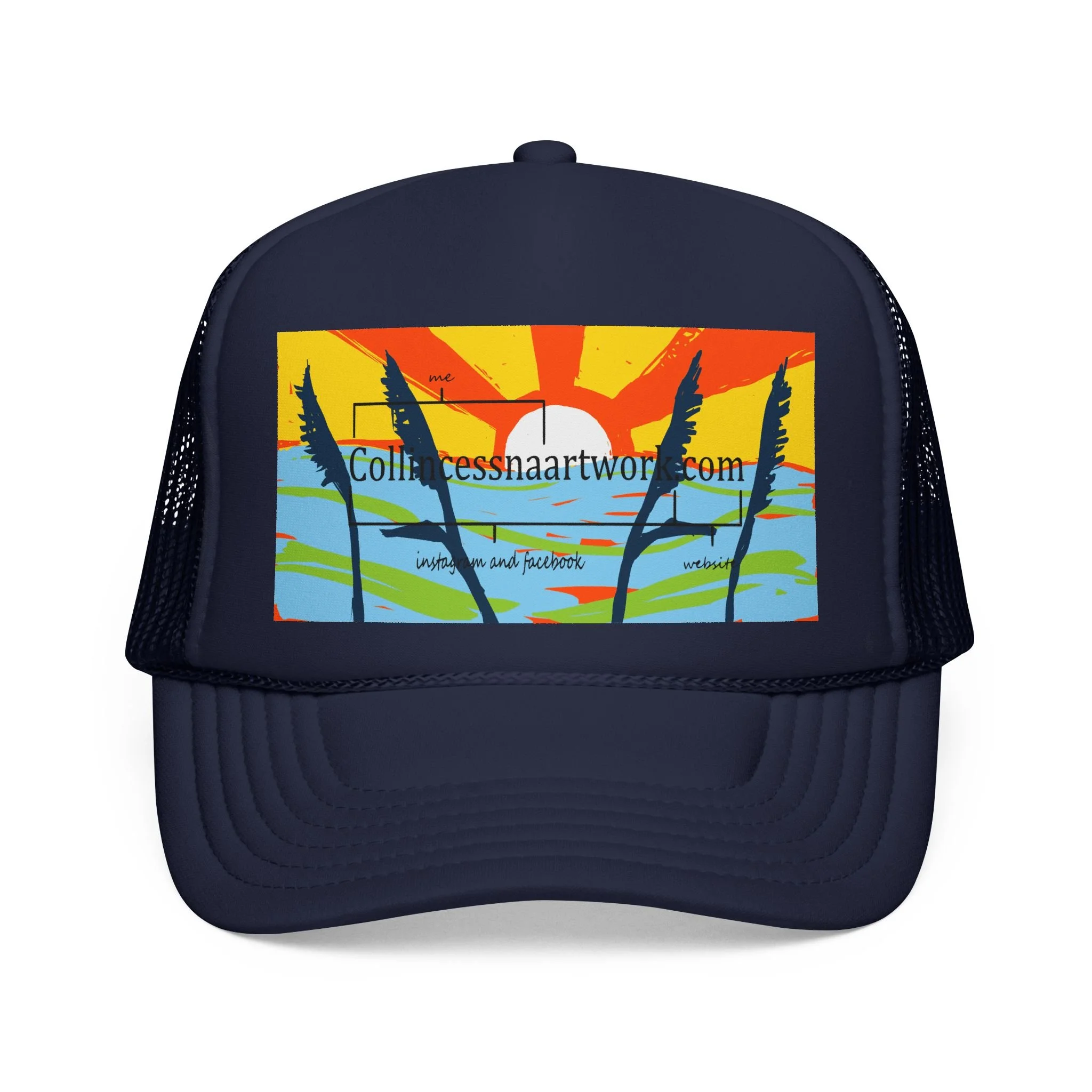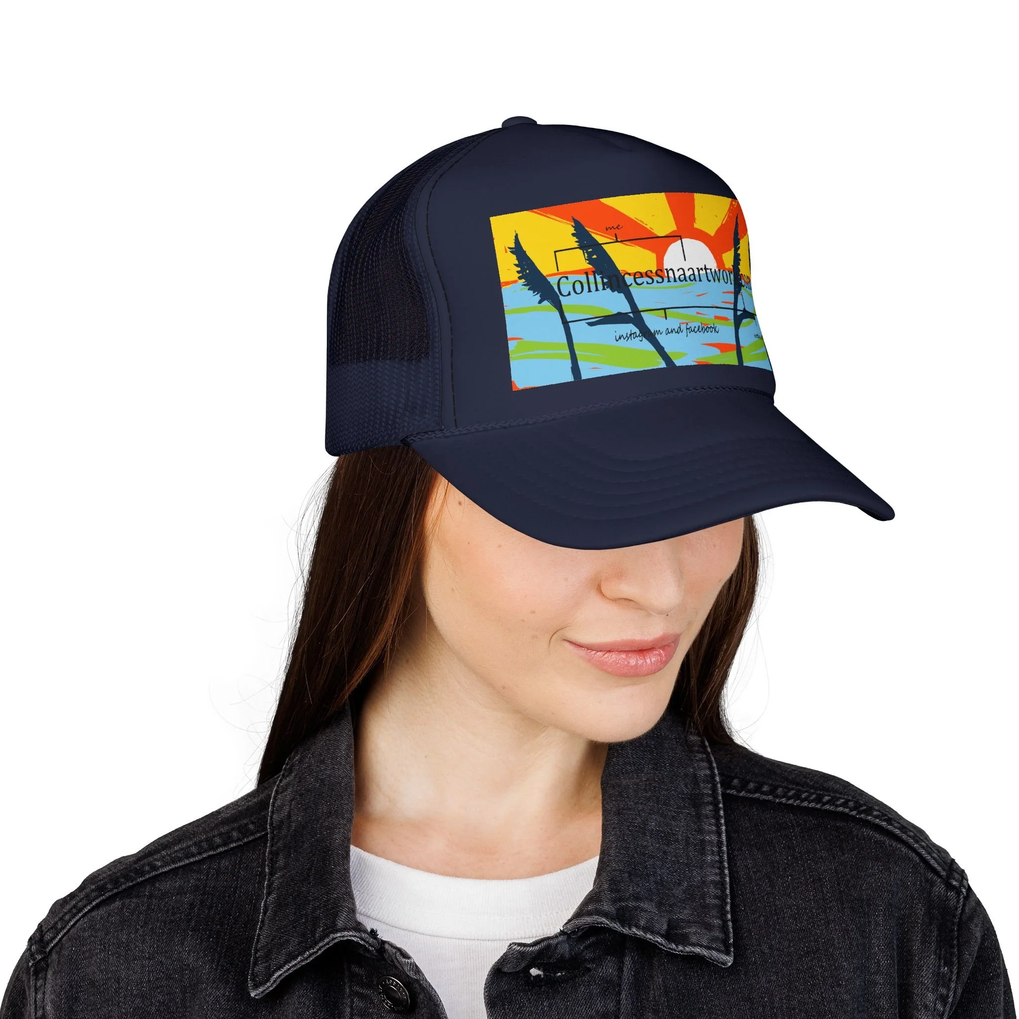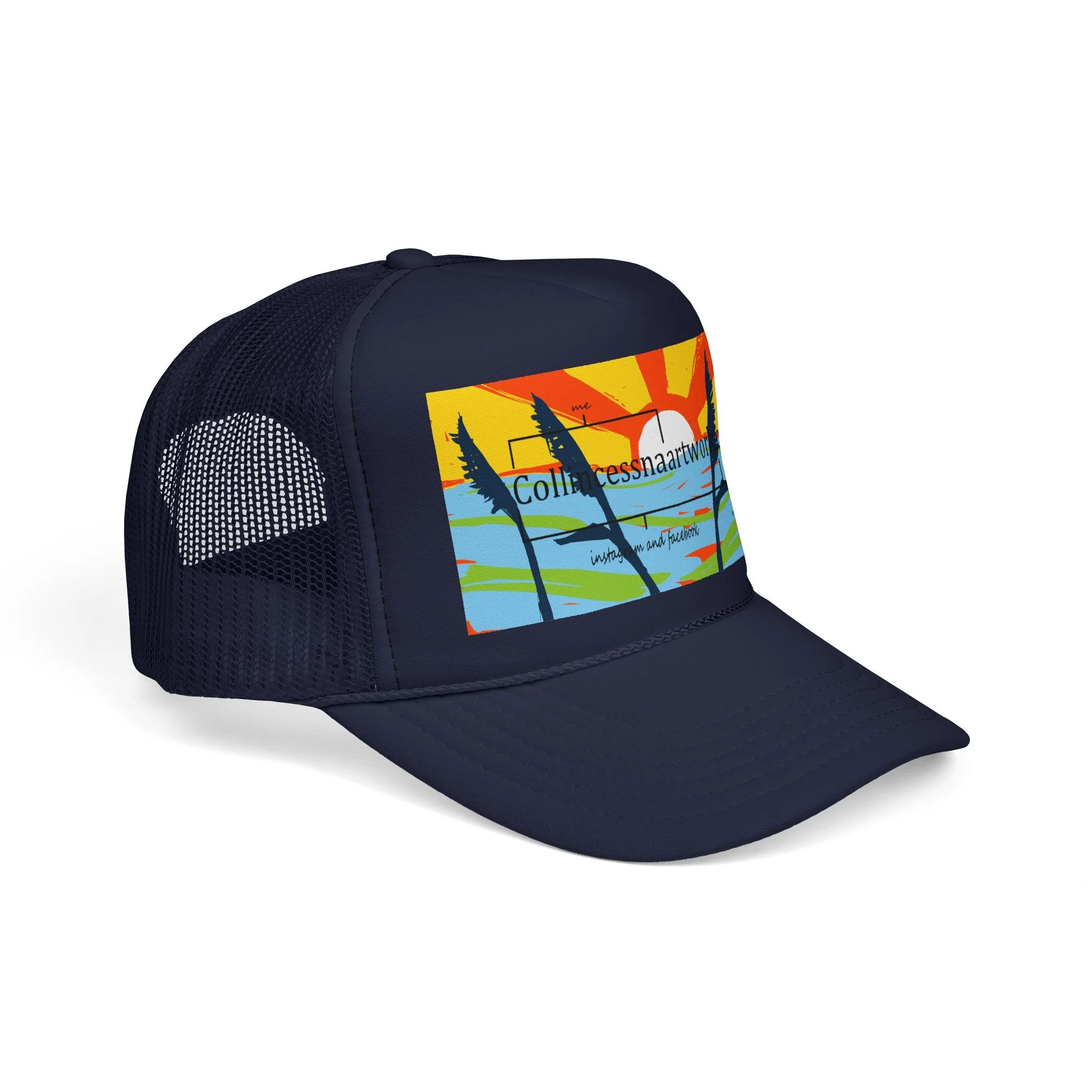 This lightweight trucker cap brings a burst of handcrafted beach‑sun energy to everyday wear. The foam front shows a sunlit artwork in saturated, fade‑resistant inks while the ventilated mesh back keeps you cool on long drives, morning surf checks, or urban strolls. The adjustable snap lets you dial in a comfortable fit, and subtle color‑matched details keep the look polished and cohesive. Wear it with well‑worn jeans, a linen shirt, or your favorite boardshorts — it adds a playful, sunny note that feels like a short escape every time you put it on.