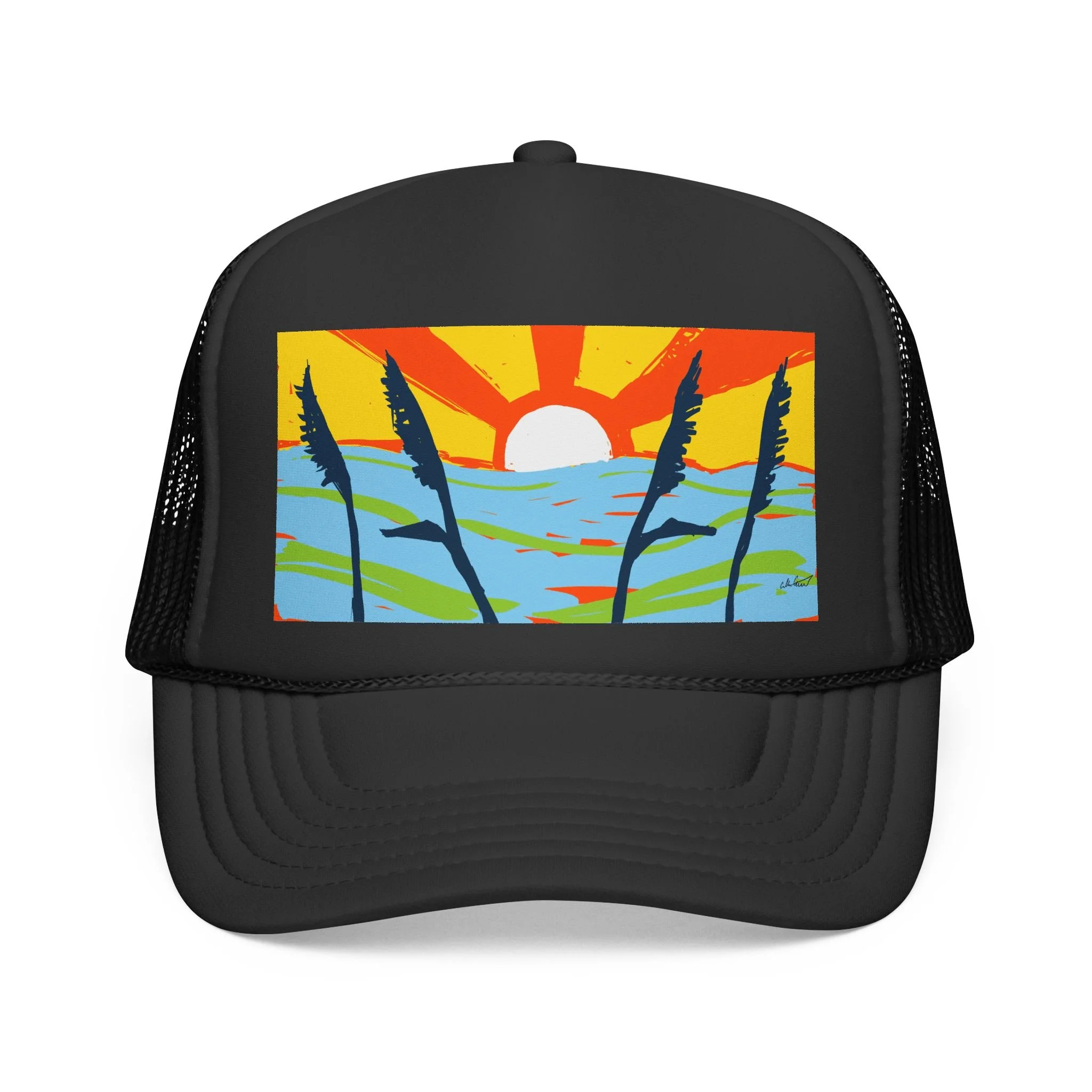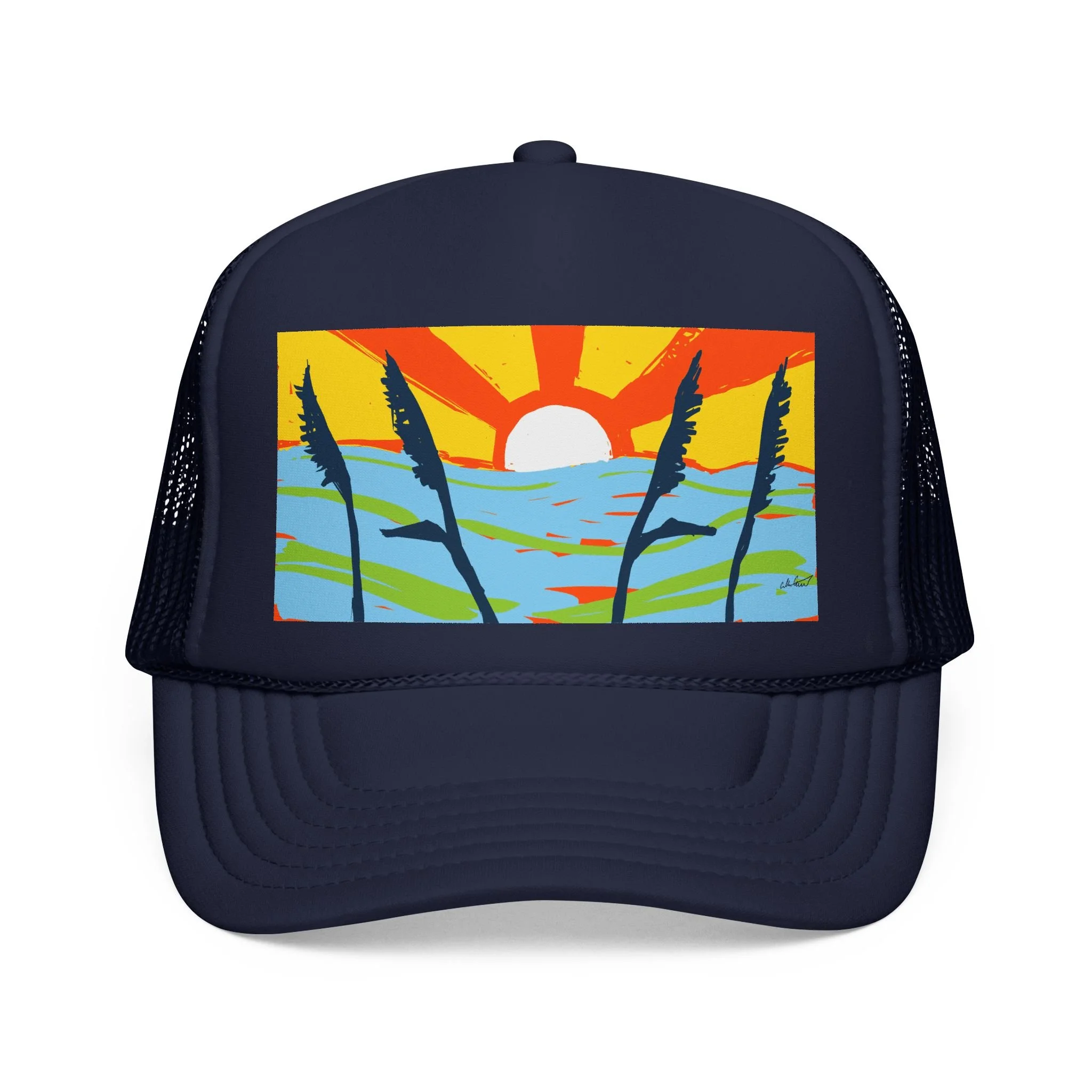 This lightweight trucker cap brings a burst of handcrafted beach‑sun energy to everyday wear. The foam front shows a sunlit artwork in saturated, fade‑resistant inks while the ventilated mesh back keeps you cool on long drives, morning surf checks, or urban strolls. The adjustable snap lets you dial in a comfortable fit, and subtle color‑matched details keep the look polished and cohesive. Wear it with well‑worn jeans, a linen shirt, or your favorite boardshorts — it adds a playful, sunny note that feels like a short escape every time you put it on.