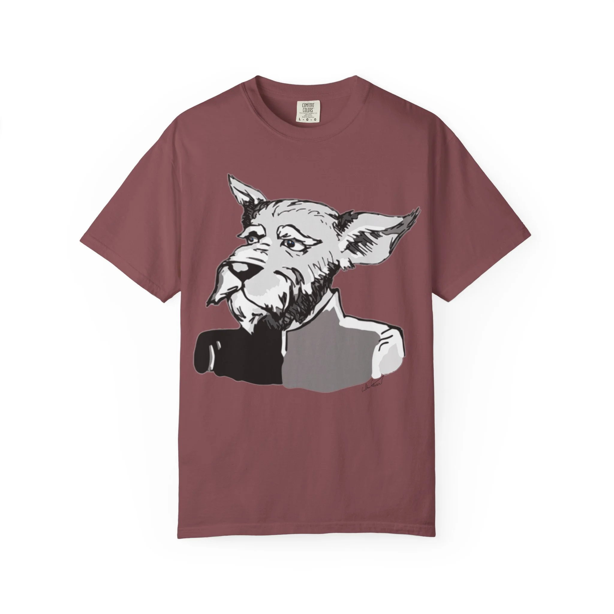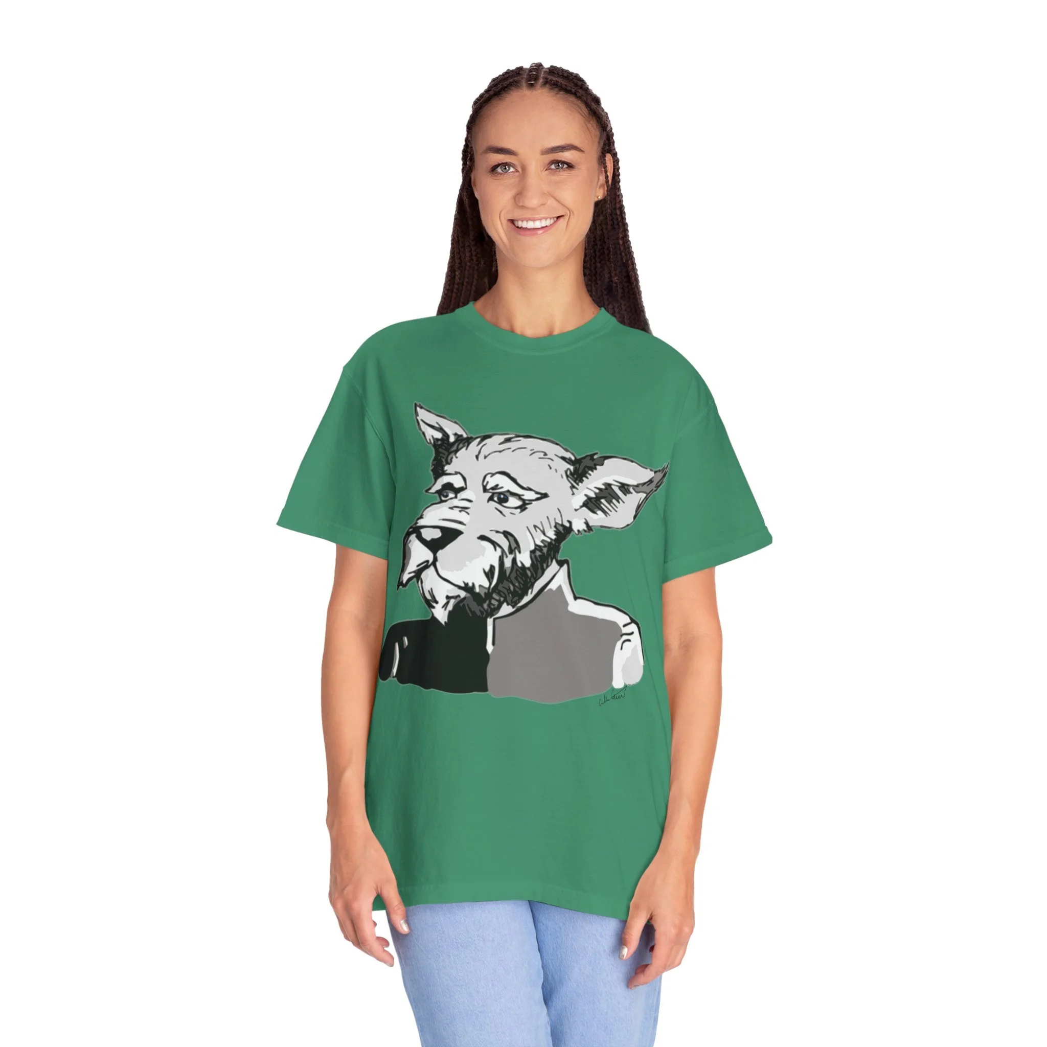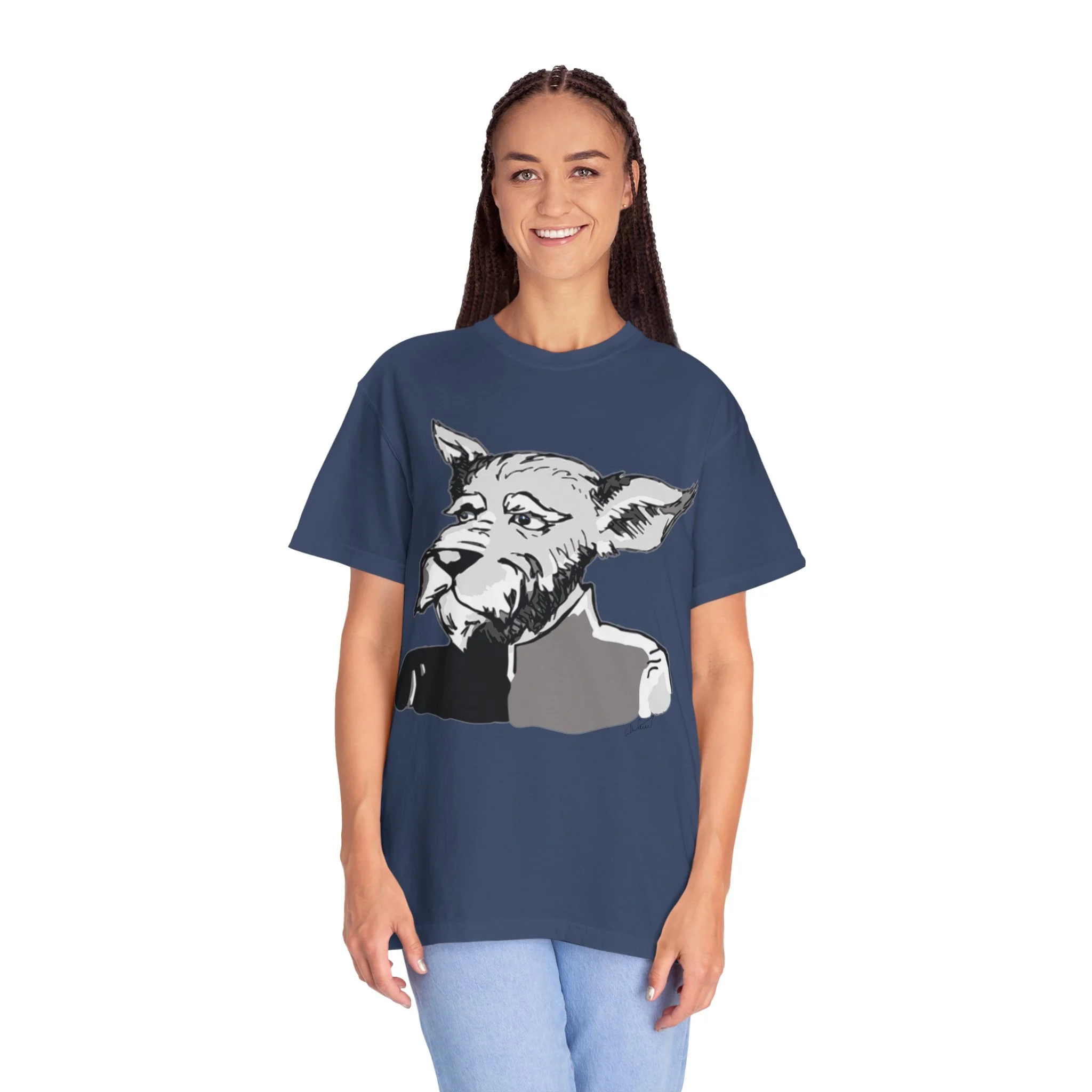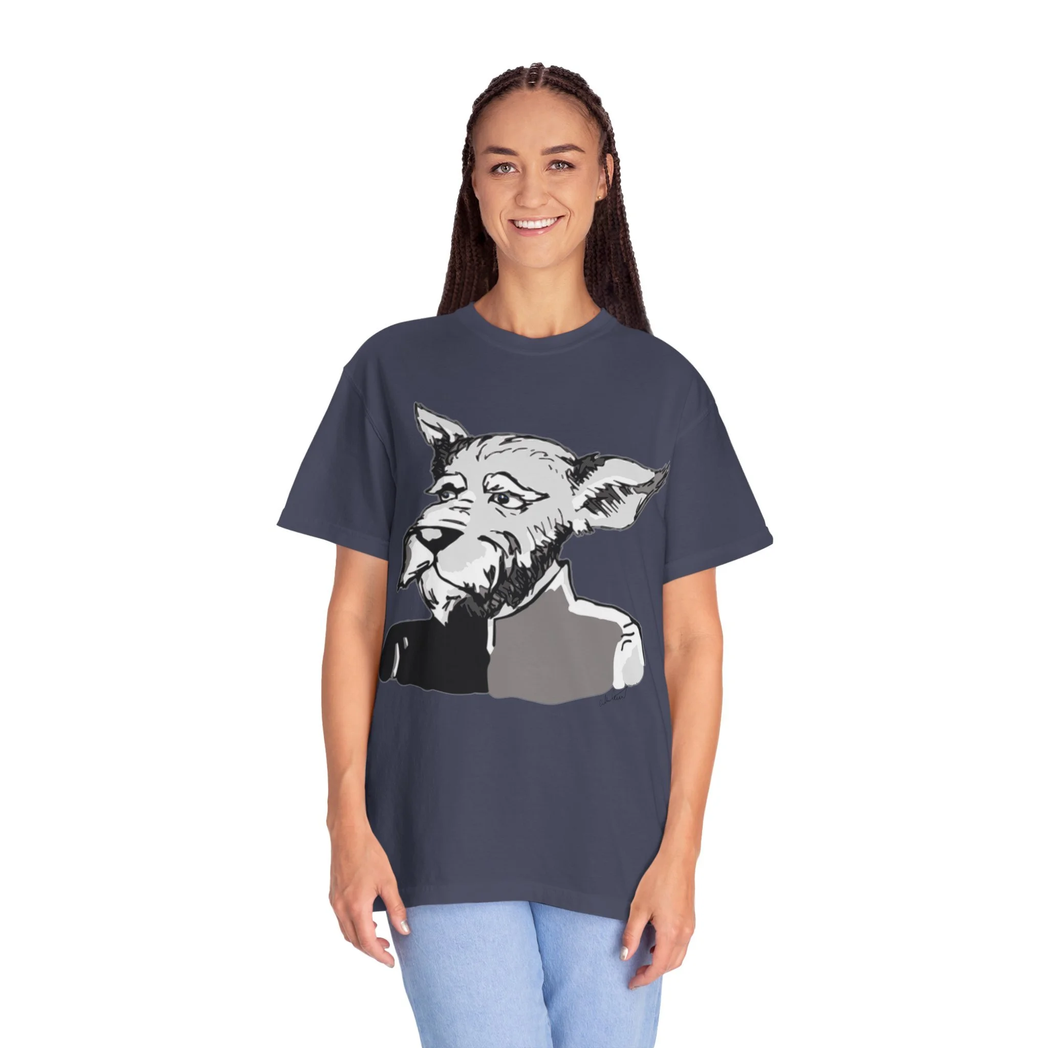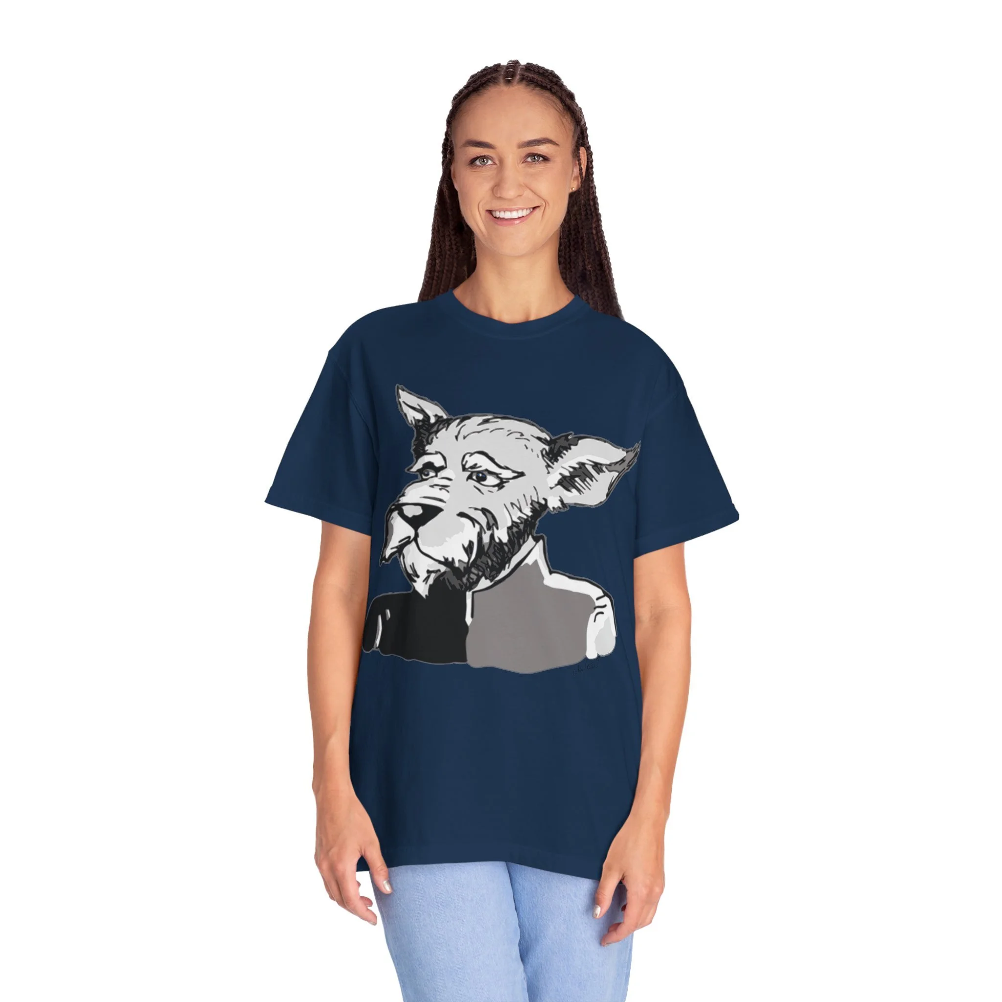 This garment-dyed tee carries a hand-drawn, slightly surreal canine portrait that feels equal parts curious and wry. The soft, washed color of the fabric and relaxed fit make it read like a worn-in favorite from day one. Picture a slow Saturday wandering an indie market or a late-night coffee run — the shirt layers easily under a jacket or stands alone as a quiet statement piece. The artwork adds personality without shouting; it suits people who collect oddball art, love low-key humor, or want a wearable sketch that sparks conversation. The overall mood is mellow, artful, and a little mischievous — a shirt you reach for when you want comfort and subtle character.