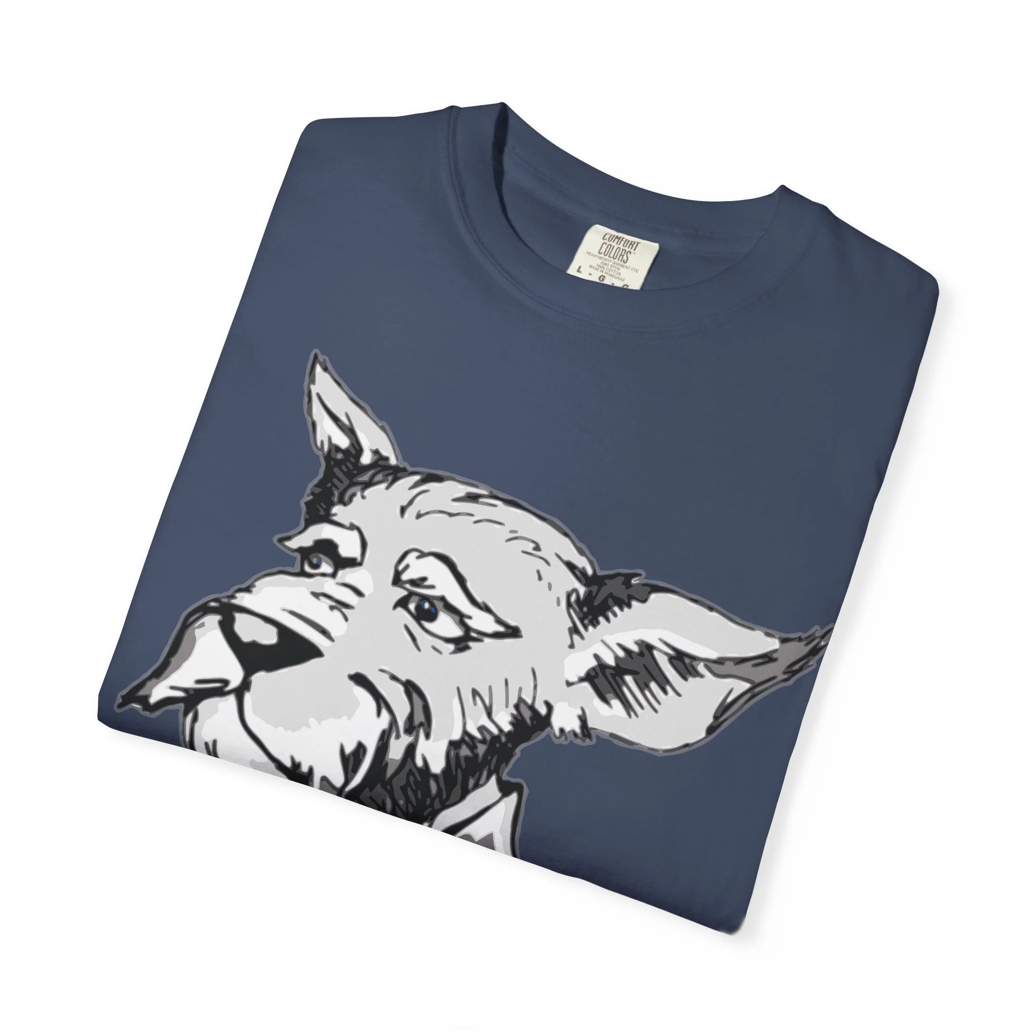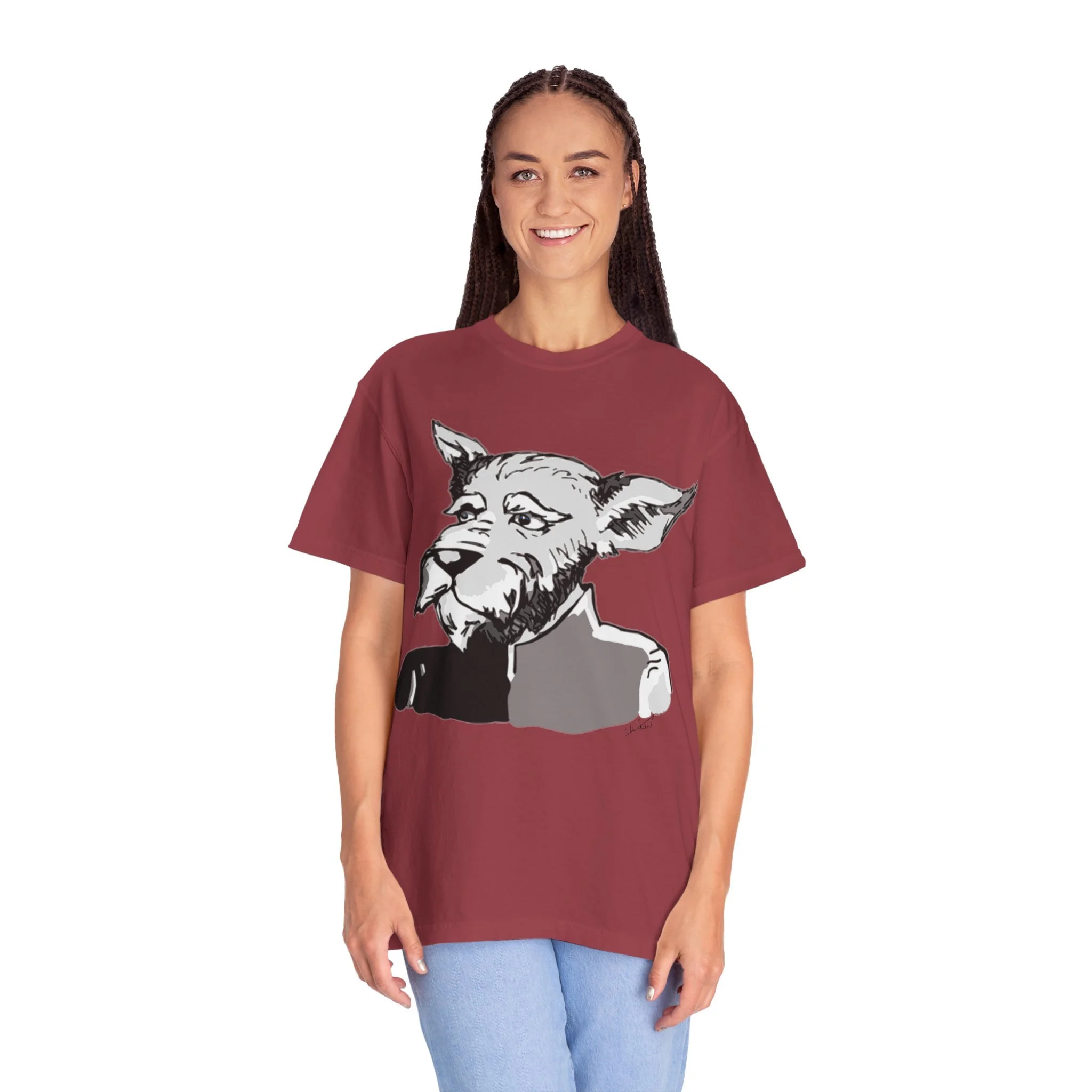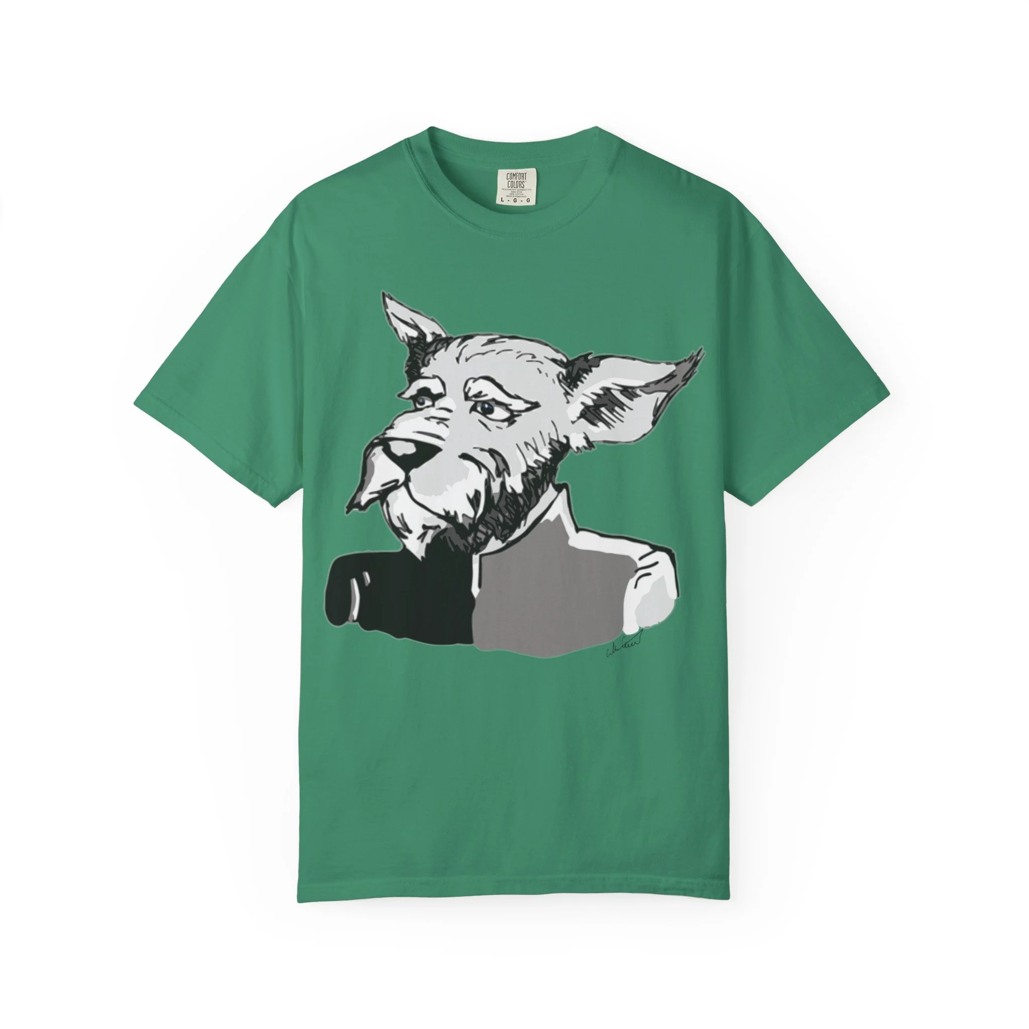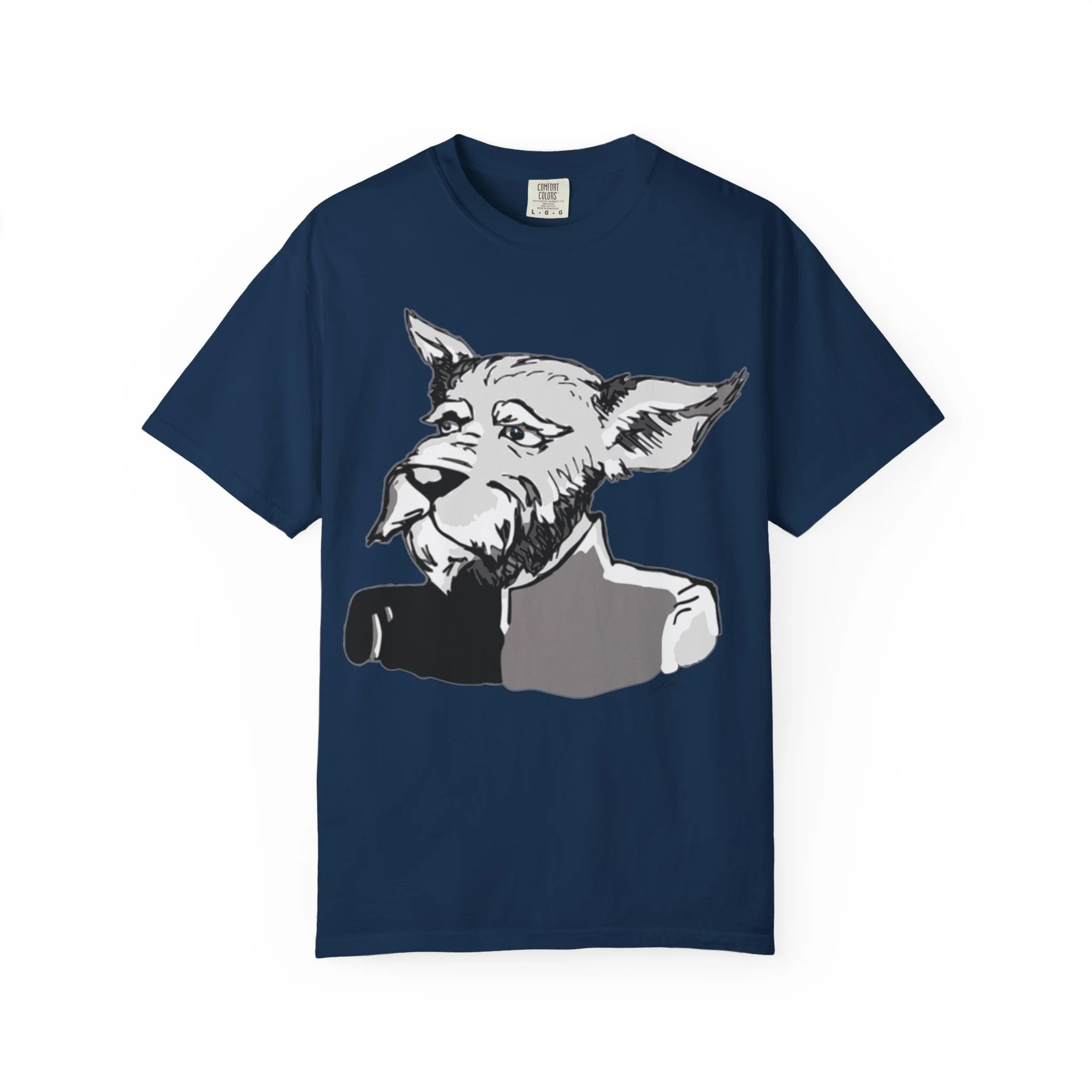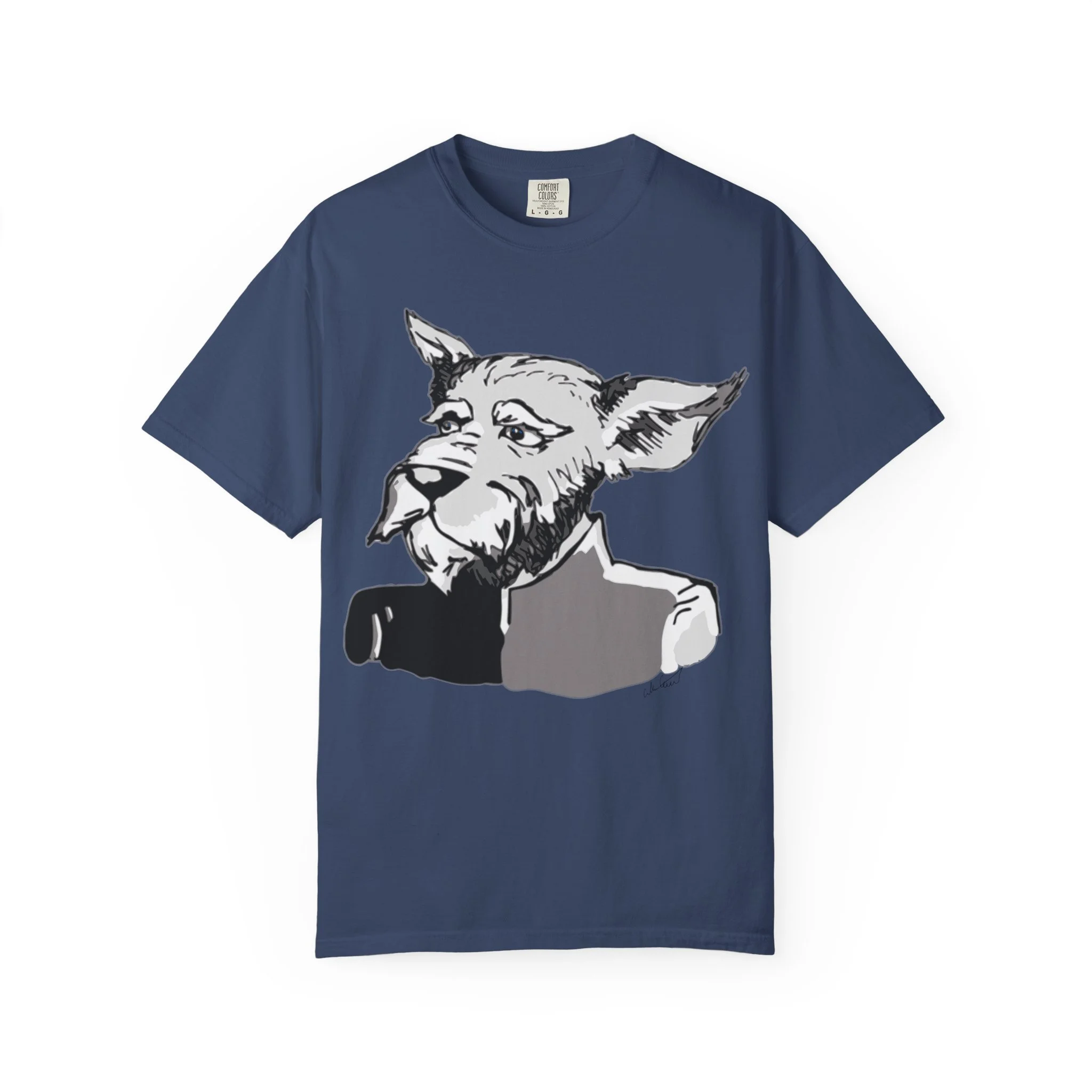 This garment-dyed tee carries a hand-drawn, slightly surreal canine portrait that feels equal parts curious and wry. The soft, washed color of the fabric and relaxed fit make it read like a worn-in favorite from day one. Picture a slow Saturday wandering an indie market or a late-night coffee run — the shirt layers easily under a jacket or stands alone as a quiet statement piece. The artwork adds personality without shouting; it suits people who collect oddball art, love low-key humor, or want a wearable sketch that sparks conversation. The overall mood is mellow, artful, and a little mischievous — a shirt you reach for when you want comfort and subtle character.